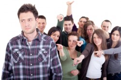 jeer - Laughing or shouting insults at someone to show you have no respect for them.