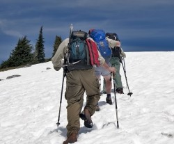 trudge - To walk slowly and with heavy steps, typically because of exhaustion or harsh conditions